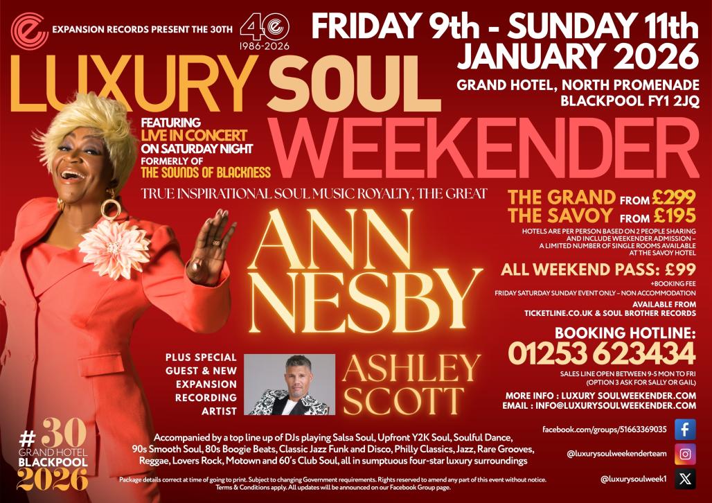 Over 30 top DJs in 4 rooms featuring a live concert on Saturday night. DJs play the best in Soul, Rare Groove, Philly, Motown, Salsa Soul, Soulful Dance, Connoisseur Throwbacks, Jazz Funk, Modern Soul Floorfillers, Nu-Soul Flavas, lovers Rock, Soulful Ska, 80s Boogie and Old Skool Anthems. The live concert on the Saturday night is an exclusive show by soul music royalty Ann Nesby, formerly with Sounds Of Blackness ("Optimistic", "In the Spirit"...). Also flying in from Philadelphia to perform on the live Saturday show, Ashley Scott (nephew of Helen Scott of The Three Degrees), an artist mentored by Webster Lewis at Howard University and prolific in UK soul charts this year with songs from his album "Love You For All Time" including his Webster Lewis tribute "Looking Up To You".